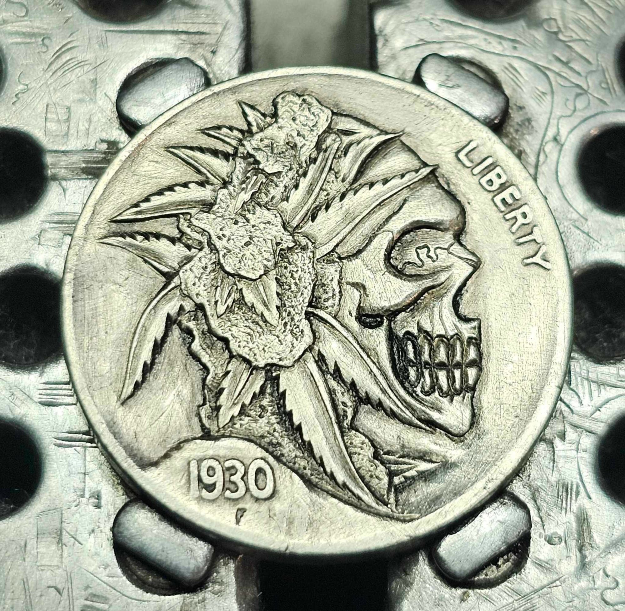 Black Friday sale. Bud Head skull coin. Carved on a random dated buffalo Indian head nickel.