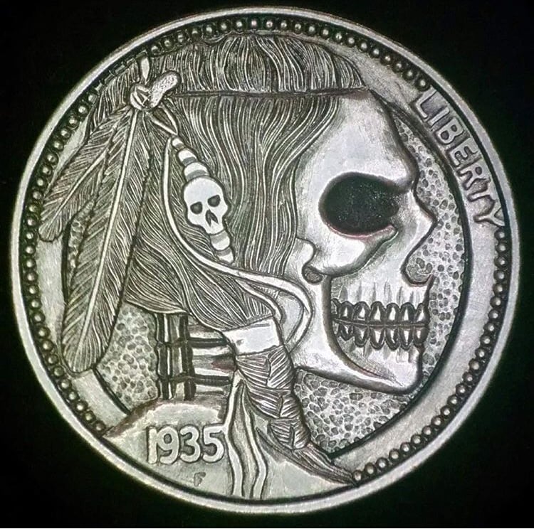 Indian Skull with hair and border hand carved into an Indian buffalo Nickel by Shane Hunter. Made to order. Random date