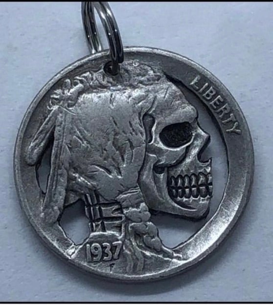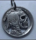 Up for sale is "ONE" sawed out Indian Head Buffalo Nickel with a skull design! These nickels are MADE TO ORDER and will be hand carved and sawed out by Shane Hunter. There will be a split ring attached to be used as a key fob or necklace.