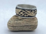 Silver 16g 7/16" wide band w/ brass filigree scroll overlay and black stippled background w/ hammer textured borders. These rings are made to order and will ship within 10 days.